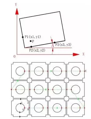 启动自动寻边功能后,切割头从P点出发,自动测得板料两垂直边上的3点:P1、P2、P3,并据此自动计算出板料的倾斜角度A,以及板料的原点。